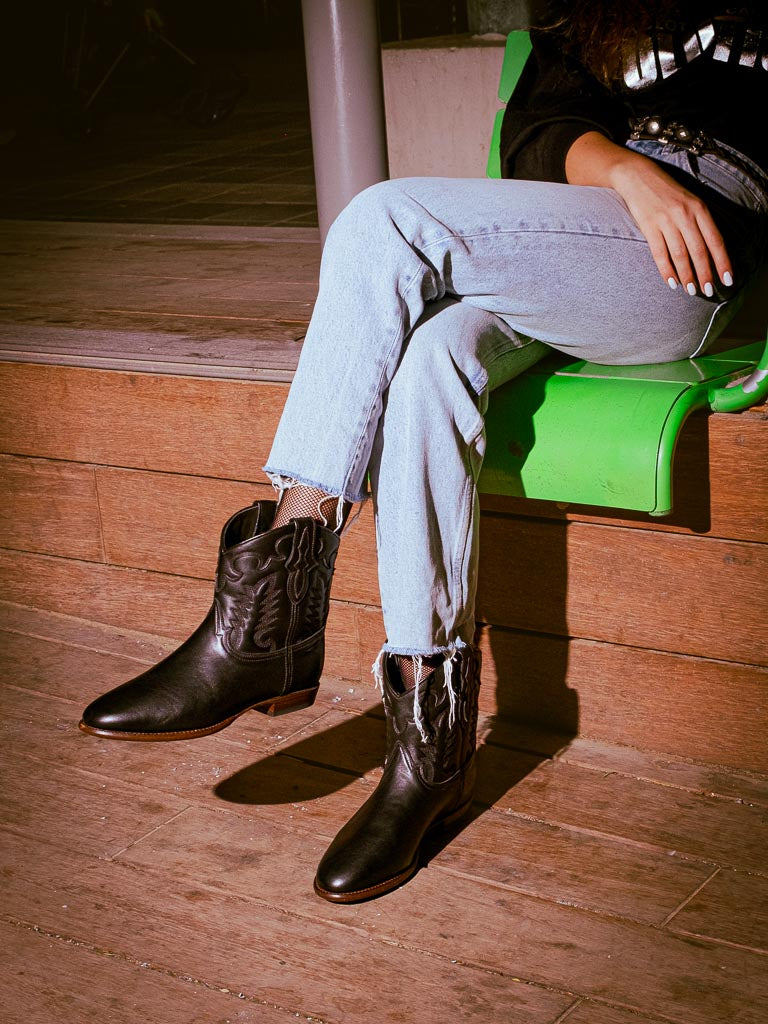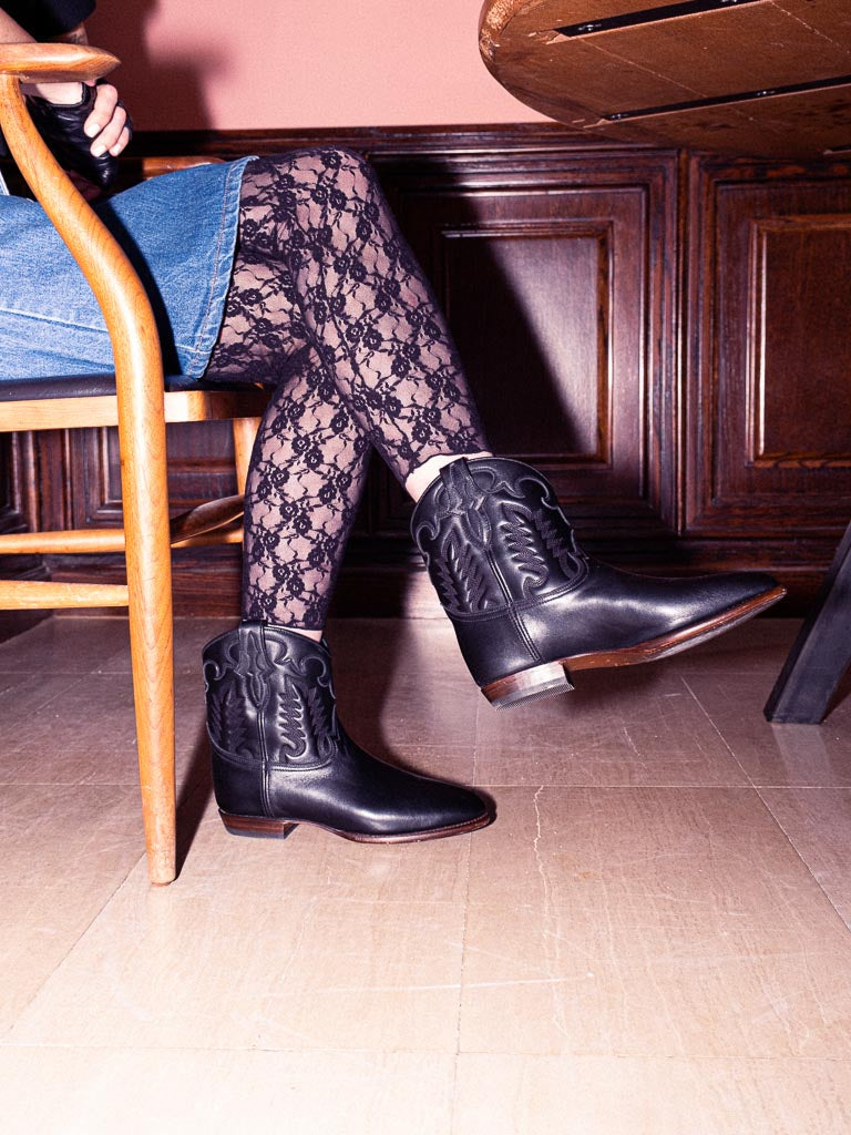 The Early Midnight ankle Cowboy boots in black leather are inspired by aged leather goods. Their deep black hue evokes the patina of time that enriches without altering, reminiscent of the mysterious allure of endless nights and the freedom of vast urban landscapes.