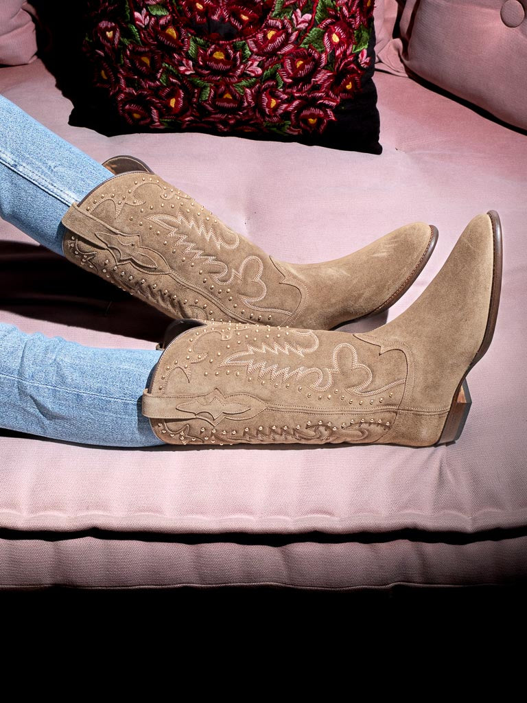 The Midnight Studs Cowboy Boots in Chestnut are inspired by the richness and warmth of wooded landscapes. The golden studs add a touch of brilliance, reminiscent of sunlight filtering through the trees, and their discreet elegance reveals refined boldness.